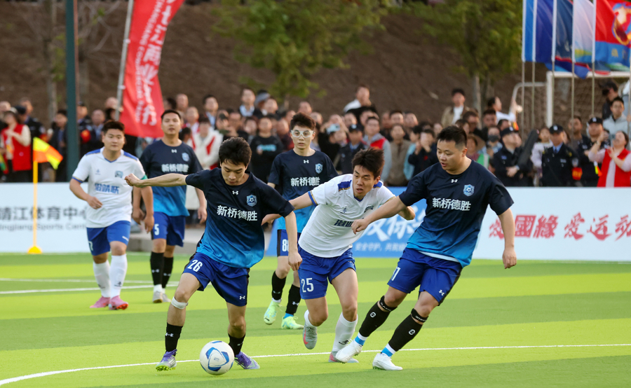 开幕式上,300架无人机在夜空中亮起“江畔村超”四个大字,又变身蟹黄汤包、长江江豚等靖江特色IP,为现场观众奉献了一场精彩的无人机表演。紧接着,新桥德胜队和澄靖联队展开了激烈角逐,最终双方0:0握手言和。